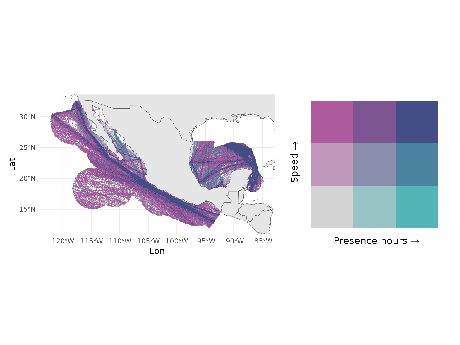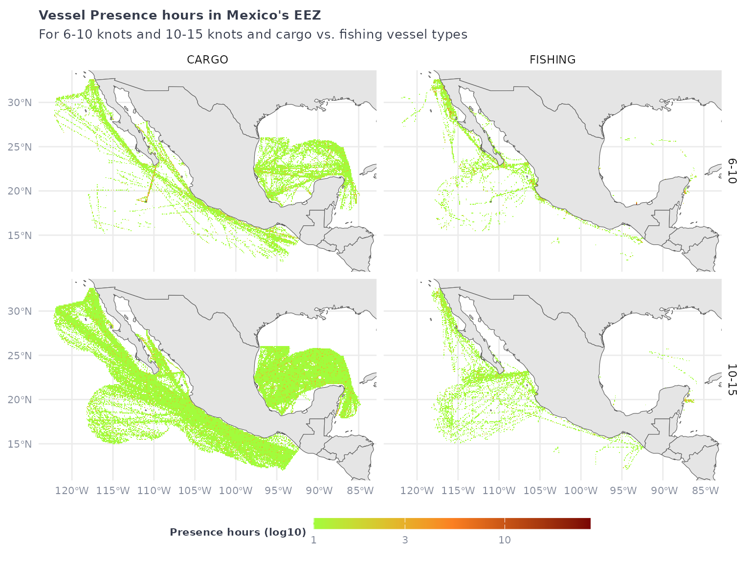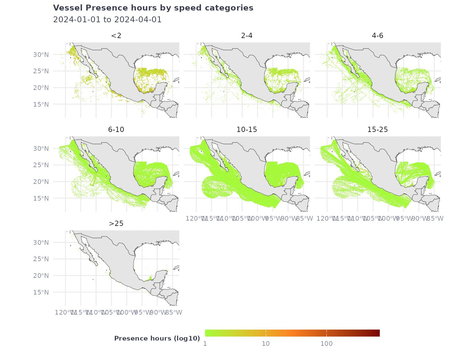 To retrieve data binned in multiple (or all) speed classes, we can loop across the desired speed categories. Let’s make another example in the Mexico EEZ.