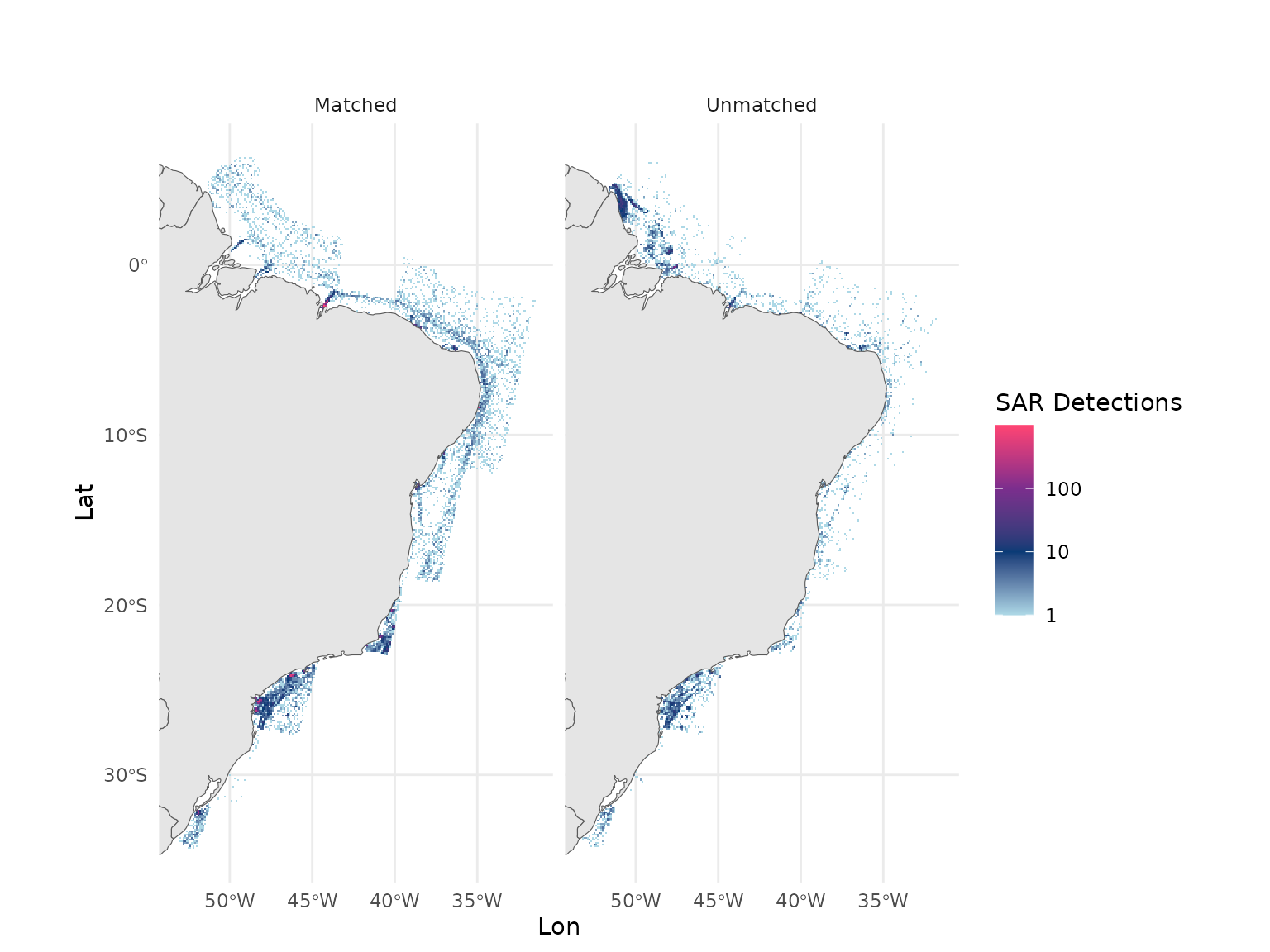 #> # ℹ 1 more variable: Detections <dbl>In this example in the Brazilian EEZ, roughly a fifth of the detections were unmatched to AIS.